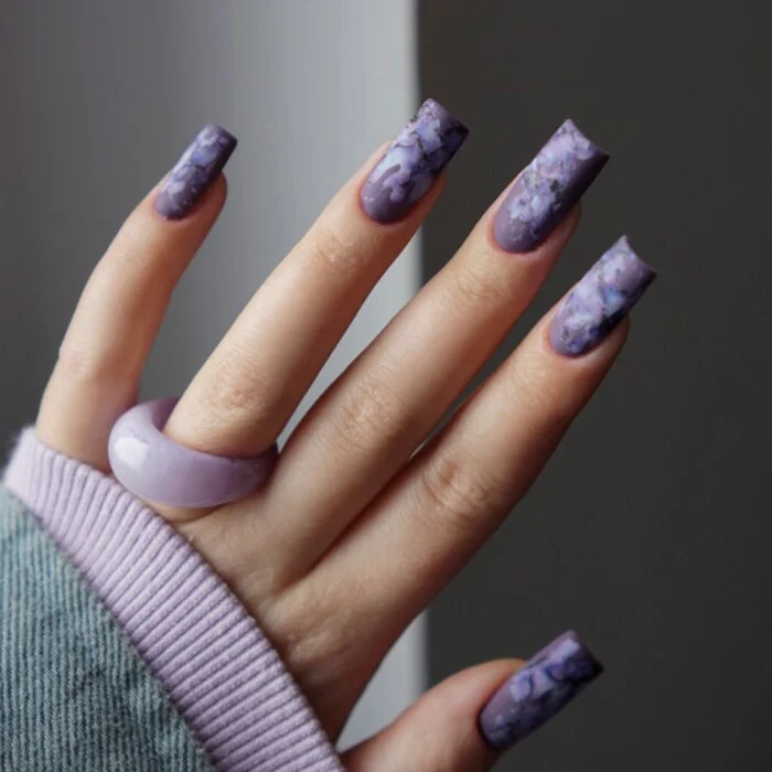 Трансферното фолио е лесен начин да създадете впечатляващ дизайн. Лилавият графичен мрамор ще привлече погледите. Може да го приложите на определено място, върху цялата повърхност на нокътя или върху конкретни нарисувани декорации.